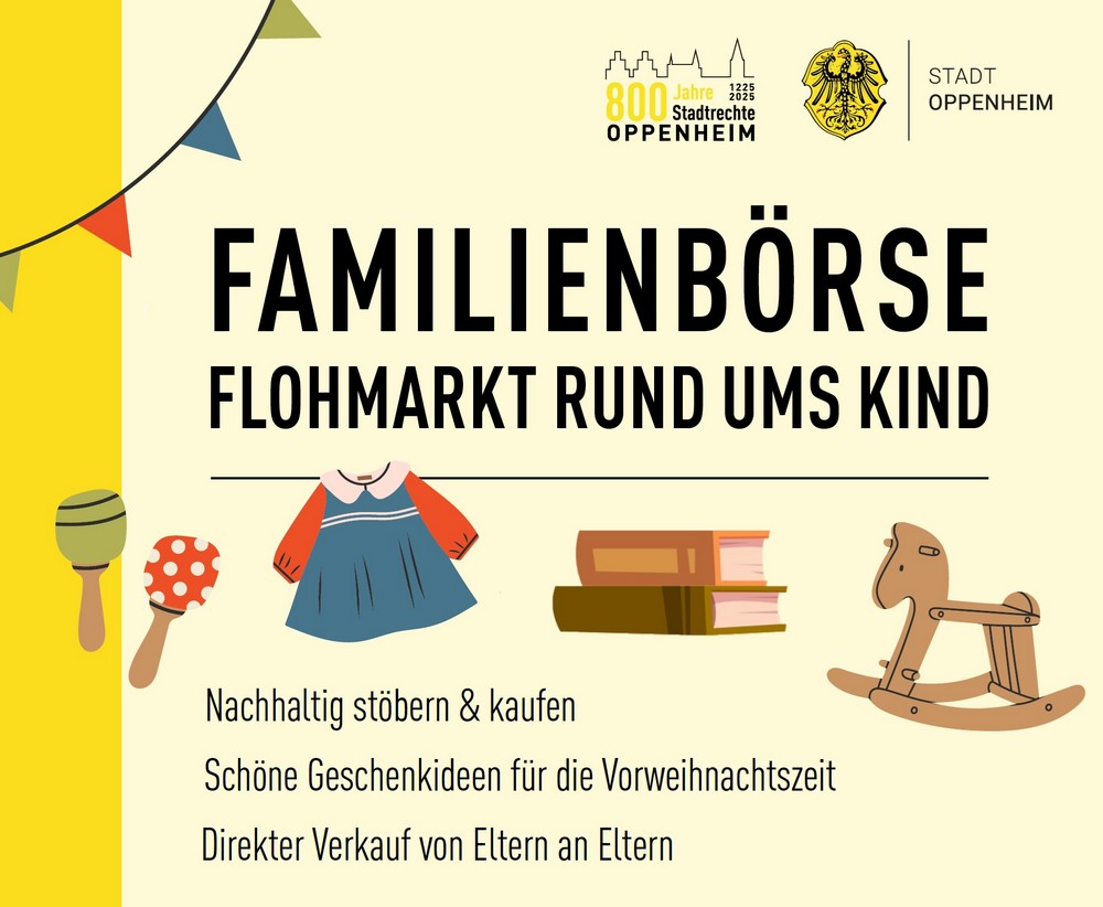 Am Sonntag, den 22. November, lädt die Stadt Oppenheim erstmals ein zu einem Flohmarkt rund ums Kind: Von Kleidung und Spielzeug bis hin zu Kinderbüchern und Familienbedarf wird bei der FamilienBörse nachhaltiges Stöbern und Kaufen großgeschrieben. Die Veranstaltung findet von 14.00 bis 17.00 Uhr in der Emondshalle statt. „Mit dem Termin im November bietet die FamilienBörse eine ideale Gelegenheit, um