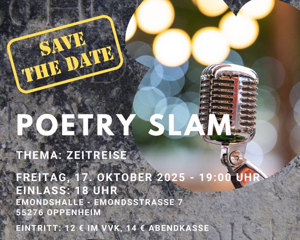 Am Freitag, den 17. Oktober 2025, verwandelt sich Oppenheim in eine Bühne für große Worte, feine Pointen und packende Geschichten. Ab 18.00 Uhr öffnen sich die Türen zum Poetry Slam „Zeitreise“, der ganz im Zeichen der 800 Jahre Stadtrechte steht.Poetry Slam – das bedeutet, Literatur wird lebendig. Auf der Bühne verschmelzen Poesie, Humor, Erzählkunst und Performance. Hier treffen sich Menschen,