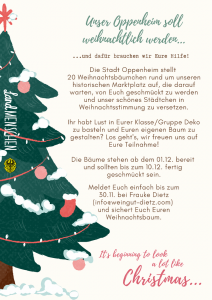 Unser Oppenheim soll weihnachtlich werden – und dafür brauchen wir Eure Hilfe! Die Stadt Oppenheim stellt 20 Weihnachtsbäumchen rund um unseren historischen Marktplatz auf, die darauf warten, von Euch geschmückt zu werden und unser schönes Städtchen in Weihnachtsstimmung zu versetzen.
