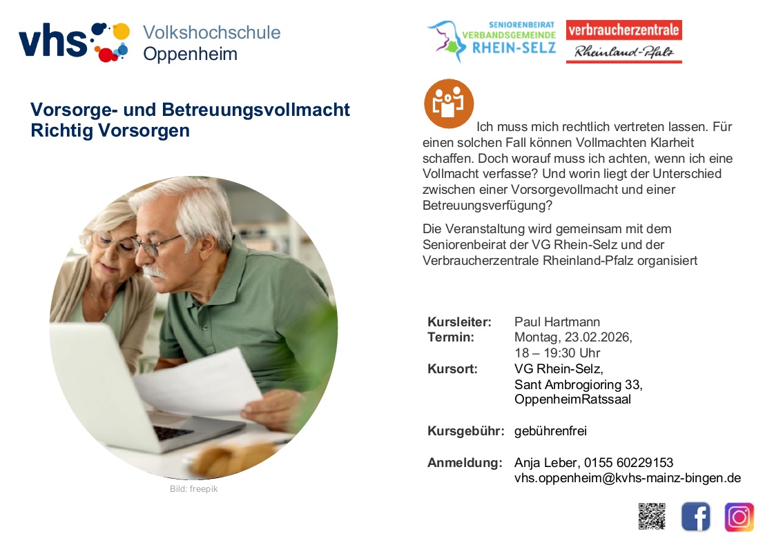 Die Veranstaltung wird gemeinsam mit dem Seniorenbeirat der VG Rhein-Selz und der Verbraucherzentrale Rheinland-Pfalz organisiert.