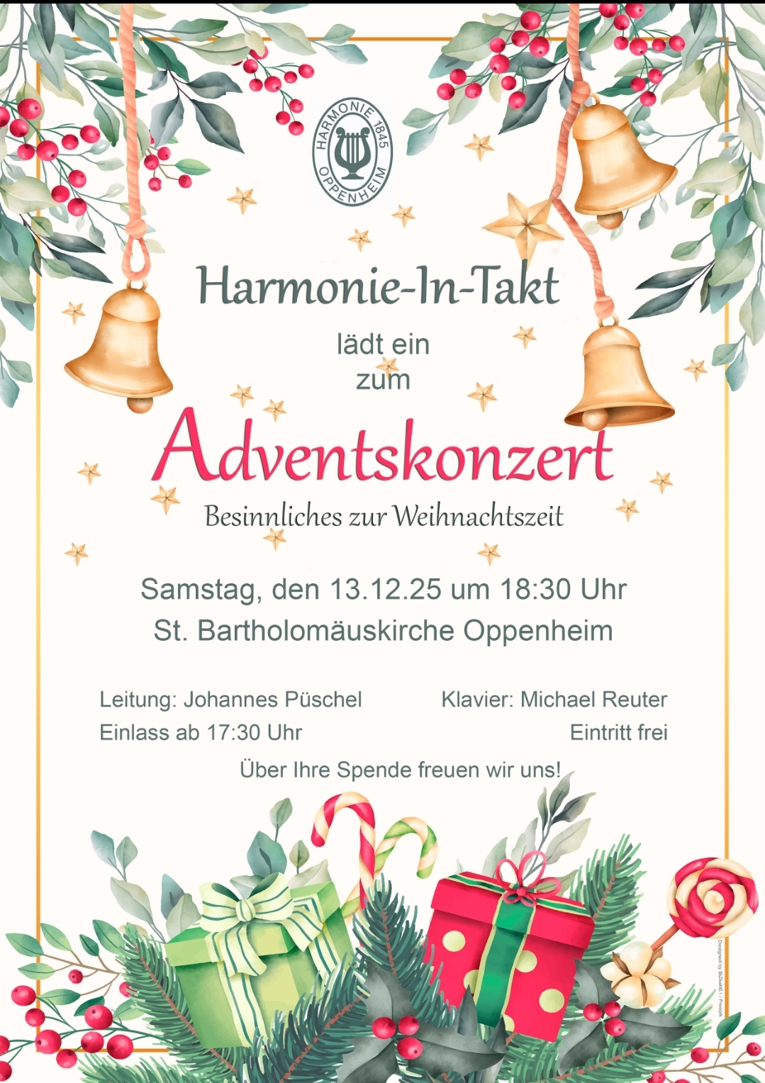 St. Bartholomäuskirche Kirchstraße 2, OppenheimAdventskonzert des Oppenheimer Chores Harmonie-In-Takt Besinnliches zur Weihnachtszeit für die ganze Familie Der Eintritt ist frei (Spenden erwünscht)