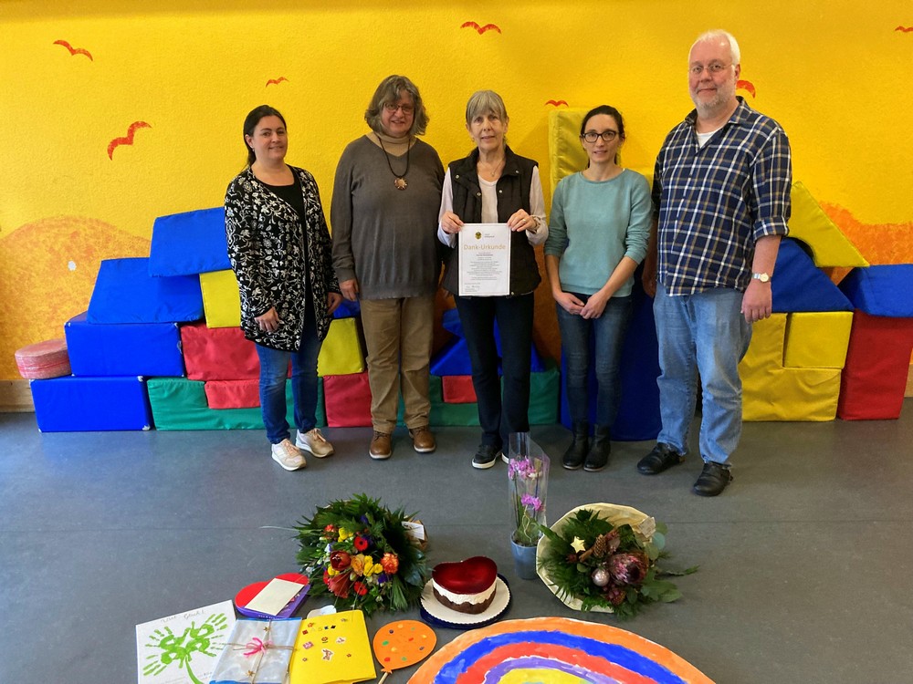 „Frau Hämmelmann hat im Rahmen ihrer Tätigkeit in der Kindertagesstätte Gänsaugraben maßgeblich dazu beigetragen, den Bildungsstandort Oppenheim voranzubringen. Sie war den ihr anvertrauten Kinder stets eine vertrauensvolle Begleiterin und Vorbild sowie Ihren Kolleginnen und Kollegen eine Bereicherung in der gemeinschaftlichen Arbeit zum Wohle der Einrichtung und der dort betreuten Kinder. Für diese geleisteten Dienste sprechen wir Ihr unseren herzlichen Dank und Anerkennung aus“, würdigte die zuständige Beigeordnete Dr. Helga Schmadel in Vertretung von Stadtbürgermeisterin Silke Rautenberg Hämmelmann, die sich ebenfalls über ein großes Dankeschön von Kita-Leiter Jochen Reichwald sowie Judith Gilbert vom Elternausschuss freuen konnte. Reich beschenkt wurde sie von den Kindern mit einem Regenbogenlied und Selbstgebasteltem.